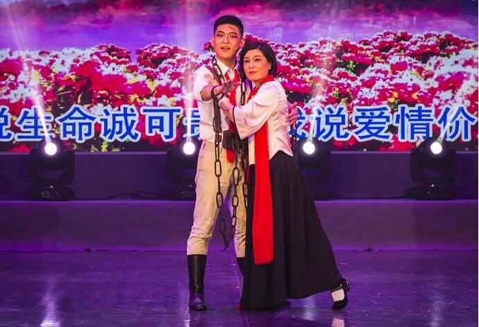 溫州銀聯(lián)公司員工黃益明應(yīng)邀參加蒼南縣建黨95周年文藝晚會(huì)的演出,出演越劇《刑場(chǎng)上的婚禮》。講述的是:1928年2月,廣州起義工人赤衛(wèi)隊(duì)總指揮周文雍和廣東婦協(xié)陳鐵軍夫婦,由于叛徒告密,二人被捕。在獄中,陳鐵軍和周文雍互相激勵(lì),經(jīng)受住了敵人的威脅利誘和嚴(yán)刑拷打,在就義前,他們當(dāng)眾莊嚴(yán)宣布在刑場(chǎng)上舉行婚禮。